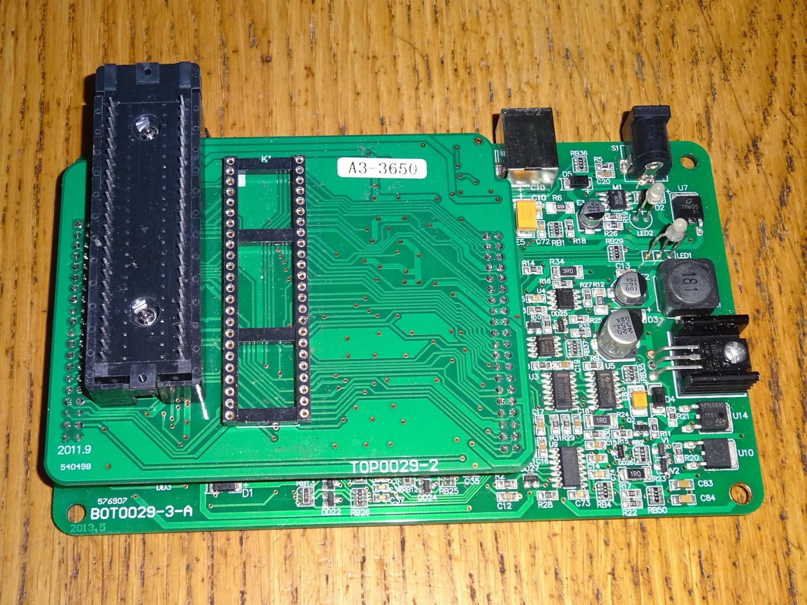 The top board contains the ZIF socket, and on the back, a load of 74HC595 shift registers, transistors, diodes and resistor arrays.