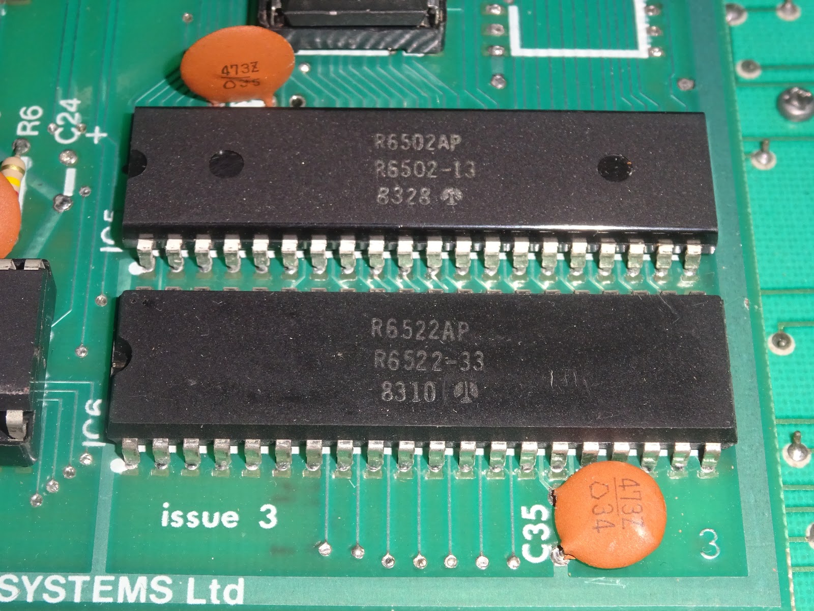 I borrowed the known working 6520 from the VIC20 and tried that in the Oric (those blue circles are a dead give away).
