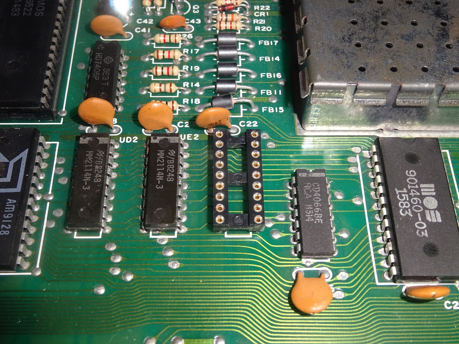 One 18 pin socket fitted. Time to find a replacement. Since the colour RAM is out on it's own, I don't think it is as important to match the part of speed grade, as it would be if it were part of a bank of similar chips.