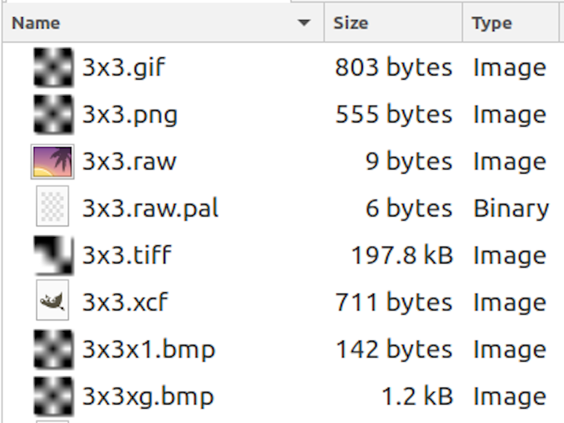 I created a 3x3 test image and tried saving it in various file formats, to see how large the files were, and how easy it would be to generate a run of 512 of them automatically.